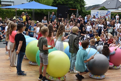 Unter der Leitung der jeweiligen Lehrkräfte und Betreuer boten die Kids ein abwechslungsreiches Programm. Gekonnt führten Lisa Hepfner und Paul Hofmann durch den Nachmittag. „Wir begrüßen zum Schulfest“ intonierten die Klasse 1a freudig. „Are you Ready?“, wollten die Kinder der Klasse 1c von den Gästen wissen. „Drums Alive – Chocolate“ hieß es beim Trommeln auf Gummibällen bei der Klasse 1 b. Akrobatisch präsentierte sich die Klasse 2a. „Schön ist es auf der Welt zu sein“, getreu dem Motto von Roy Black, hieß es bei der Klasse 2b. Mit einem tschechischen Lied glänzte die Arbeitsgemeinschaft Tschechisch. „Shalala“ schallte es bei der Klasse 3a durch den Pausenhof. Bei „Major Tom“ hoben die Schüler der Klasse 3b ab. Mit Samba versprühte die offene Ganztagsklasse südamerikanische Lebensfreude.