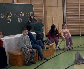 Am Nachmittag der Schuleinschreibung wartete in der Turnhalle eine kleine Überraschung auf die zukünftigen Schulanfänger. Die Schüler und Schülerinnen der Klasse 1a hatten mit ihrer Lehrerin Monika Uschold ein kurzes Theaterstück für die Vorschulkinder eingeübt. So spielten sie voller Elan als Maus, Schlange, Eule und Fuchs verkleidet den Kindern „Der Grüffelo“ nach der Bilderbuchvorlage von Julia Donaldson vor. Dabei überlistete die kleine Maus alle Tiere, die sie fressen wollten und am Schluss sogar den Grüffelo.